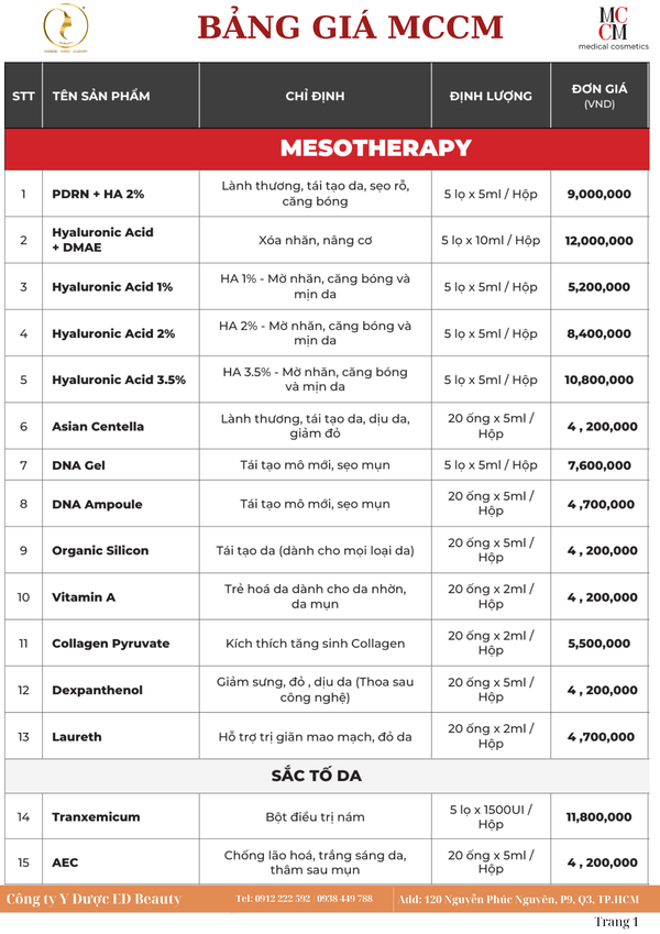 giá mccm cập nhật 2025, phân tích chi phí meso mccm, bảng giá peel mccm, mccm 1cc và giá trị liệu pháp mccm cho khách hàng